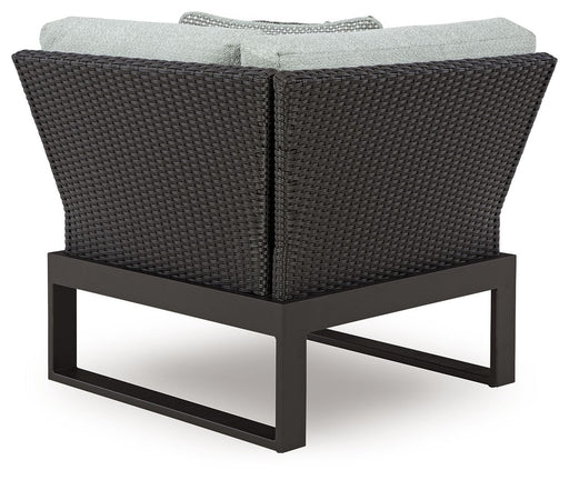 This outdoor corner chair with cushion is made with aluminum, resin wicker and Nuvella+™ (polyester) UV-resistant, cleanable fabric. Pairs with oth...