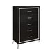 The Huxley 5-Drawer Chest combines contemporary glam with durable construction for a stylish addition to your bedroom. This vertical dresser is crafted from manufactured woods and eco-friendly decorative laminate, ensuring it will stand the test of time. The design features clean lines with metallic accents and flared silver legs, adding a modern touch. Its rich finish provides a sleek, sophisticated look that is both timeless and modern, highlighting the metallic accents and smooth surfaces for a chic and polished aesthetic. The quality drawer construction includes English dovetail joinery and smooth-rolling center glides for long-lasting operation. Functional and fashionable, this chest offers ample storage for clothing, with chic, crystal-studded drawer pulls for easy access.