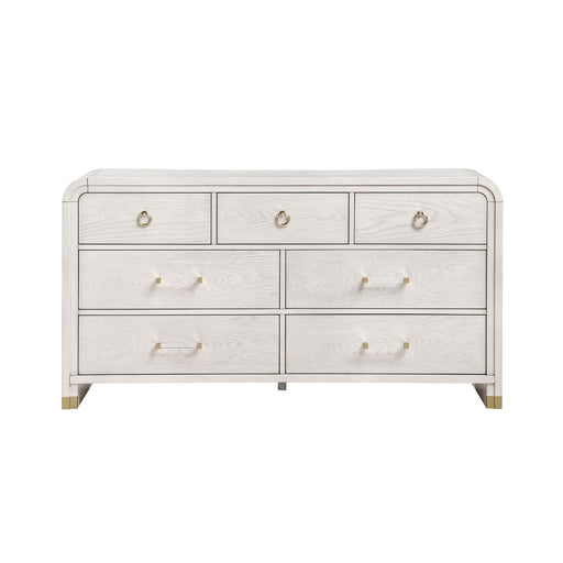 The epitome of fashion-forward design, this dresser is a beautiful blend of style and luxury. Shiny chrome-tone accents, a pearlized finish and mos...