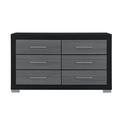 This contemporary six-drawer dresser is designed with clean lines and a light elm finish to complement modern spaces. Brushed nickel fingertip pull...