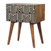 Solid Wood Edessa Bone Inlay Bedside - This stunning boho-inspired bedside table is crafted from 100% solid mango wood and features a lovely finish. It also boasts bone inlay on the front drawers and sleek Nordic-style legs. The bone inlay is ethically sourced from deceased animals, including camels, goats, and buffaloes.