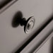Transitional style includes tapered legs, molded crown edged table top, and antique pewter round decorative knobs