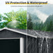 - Included Accessories: Comes with a metal foundation frame, anchors, hooks, a shelf, a locker (padlock), and gloves. Made of electro-galvanized steel with strong corrosion and UV resistance.