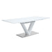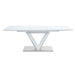 This Gallegos dining table adds a modern silhouette and a mix of glam materials to your dining room. It's crafted from a blend of engineered wood and stainless steel, and it showcases a shiny finish that's sure to make a style statement in your home. This table is built on a pedestal base with a V-shape design for an airy open look. The rectangular tabletop is finished in high-gloss white for an elegant look that is also easy to clean. This dining table is ideal for seating up to eight people with its butterfly extension leaf.
