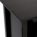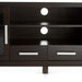 Features tempered glass doors that open to cabinets with one (1) adjustable shelf each, three central drawers with metal drawer glides and open top space for media devices.