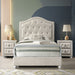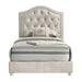 The Reggie youth bedroom set in pink fabric is full of character! Every piece in this glamorous collection features crystal-like button tuft details and cute wooden-bun legs in a crisp white finish. The panel bed features an arched headboard with a gentle curve that’s echoed in the dresser mirror. Safety stops are included on all case good drawers, as well as crystal-like pull knobs for an extra sparkle. Let the delightful Reggie collection dress up your home.