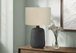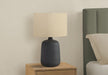 Stylish Design: The lamp boasts a vase-like shape crafted from textured black ceramic, paired with a beige linen drum shade and topped with a silver finial, adding a touch of sophistication to any contemporary decor.