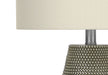 Design & Style: Contemporary 24" table lamp with a grey resin base featuring a raised, dotted texture and an ivory fabric drum shade for a boho-glam look.