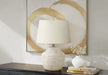 Modern Style: Features a 20" table lamp with a classic urn-shaped base and a ridged cream concrete textured finish, topped with an ivory linen tapered drum shade and a gold finial.