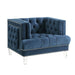 Sophistication meets modern with the Ansario living room collection. The rich blue velvet adds character to any room. Showcasing a square back, high arms, and nail-head trim, feature button tufted accents. The acrylic legs give off a modern vibe to the pieces. The full foam seats ensure that your next TV binge will be done in complete comfort.