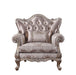 The Jayceon chair is gorgeous, with shimmery fabric upholstery that highlights the champagne finish of the wooden frame. Button-tufted seatbacks wing out under carved arches. Loose seat cushions are upholstered in a floral patterned fabric that extends over rolled arms. A scrolled floral motif adorns each piece in this addition to Acme's exclusive design collection.