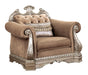 The Northville chair is exclusively designed and filled with romantic spirit. This beautiful velvet upholstered chair features carved legs, apron, and trim, decorated with raised and scrolled floral motifs in an antique silver finish. This sophisticated chair boasts of curved and rolled arms, oversized molding and button tufted backrests with nailhead trim. This collection with contrasting accent pillows will bring sophistication to your living room and will add elegance to any room Decor. Sit back and relax on this sophisticated collection that will instantly bring style to your living area.