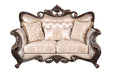 The Royal Classics Constantine Loveseat in cherry brings together heirloom quality craftsmanship and luxurious design, making it a stunning addition to any living space. Expertly crafted from solid pine and adorned with premium polyurethane carvings, this loveseat offers both timeless beauty and exceptional durability. The lightweight yet sturdy carvings resist moisture, rot, and cracking, ensuring the intricate details remain flawless over time with minimal maintenance. A meticulous multi-step cherry finish enhances the wood’s natural grain, while delicately burnished gold tipping highlights the ornate carvings, adding a touch of refinement. The loveseat's French Rococo-inspired design captures the elegance of 18th-century craftsmanship, delivering a regal, sophisticated look. The luxurious fabric blend, featuring elegant patterns and soft, sateen-like textures, enhances both the visual appeal and comfort, making it a perfect centerpiece for your living room. Crystal button-tufted backs and nailhead trims trace the graceful curves of the wood frame, adding exquisite attention to detail. Conveniently packed with unattached upholstery backs and bases, this loveseat is designed for easy transport and setup, offering both beauty and practicality for your home.