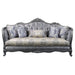 • The Ariadne sofa is fit for royalty! The platinum finish of the wooden frame complements the lustrous upholstery over button-tufted seatback and armrests. Carved flourishes crown the arched seatbacks and extend down the molding around the high shelter armrests. Accent pillows with floral patterns are included.