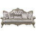 The Libertee collection sofa set is a blend of classic elegance and modern comfort. Finished in champagne, this set features a KD back, legs, and armrests with a wooden inner frame. The tight back and loose seat cushions, constructed with pocket coils, ensure lasting comfort. Adorned with button tufting, floral trim apron, and legs, it includes accent pillows and a matching wooden tabletop. This exquisite set promises to elevate any living space with its refined charm.
