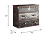 The Aberdeen collection combines different materials to bring an undeniable sensation to any living room. This sofa table features a trunk like design with stainless steel top and side panels, vintage dark brown top leather trim edging, single leather handle on each side, and three Felt-Lined drawers. This unique design is sure to transform your home with storage and style.