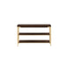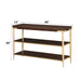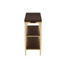 KD, Rectangular Leg Sofa Table Storage: 2 Open Compartments (2 Wooden Shelves) CONSTRUCTION Wooden Top & Shelves: Wood Veneer, Pine Wood Metal Tapered Leg & Trim: Gold finish NO Drawers