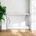 Full of sleek, visually-appealing lines, the sofa table exudes a clean and open design. Sturdy metal frame features ultra-clean lines and a contemporary aesthetic, with a chrome finish enhancing the metallic textures. Clear glass table top and bottom shelf allow light to filter into and through the whole table, making it an irreplaceable centerpiece to brighten your living room.