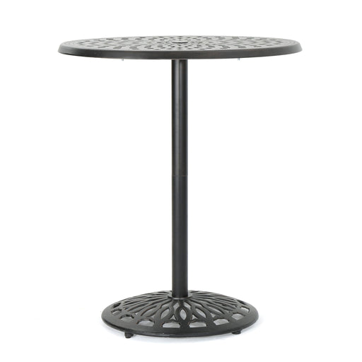 Elegant Cast Aluminum Round Bar Table With Romantic Filigree Design - Copper