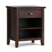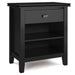 - Features one (1) spacious drawer with metal drawer glides and open bottom storage area with one shelf