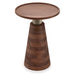 Multi-functional table features spacious round solid acacia top, antique brass look stem and solid acacia cone shape pedestal base