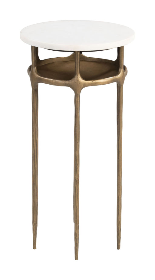 The Voler Side Table in Brass is a sleek and modern piece perfect for indoor living spaces. Crafted from iron with a polished marble top, this side...