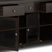 Features three (3) drawers with metal glides, and three (3) tempered glass doors that open to large storage spaces with one (1) adjustable shelf each
