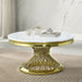 Explore the design power of mixed motifs in a round coffee table that promises to lift the ambiance in a modern space. This coffee table is constructed of lush gold finish stainless steel in a ring apron and twisted open rod cinched pedestal. Gold stainless steel configures an unusually shaped base with well-placed diminutive feet to protect flooring. Attention turns to an accessible, artificial marble top with a brilliant white finish, perfect for adding bright beauty to a living room or family room.