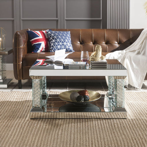Nysa - 36" Coffee Table - Mirrored & Faux CrystalsProduct Features Rectangular Coffee Table Storage: Open Compartment (Mirrored Base Shelf) Bev...