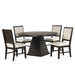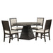 The Plateau dining set combines rustic charm with modern comfort. Crafted from solid Rubberwood and Oak veneers, the 54" round table features a rich finish with heirloom-style distressing and a bold pedestal base. Upholstered side chairs offer channeled backrests, clean lines, and cozy support. Ideal for intimate meals, this set brings timeless style, everyday durability, and inviting comfort to your dining space.