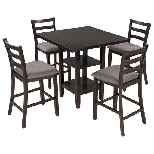 5 Piece Wooden Counter Height Dining Set With Padded Chairs, Storage Shelving