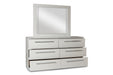 Complete your bedroom with the Sapphire Dresser Mirror in high gloss white. Expertly crafted from high-quality manufactured wood, this mirror features a flawlessly smooth, ripple-free surface and a glossy white laminate finish for a sleek, contemporary look. The wide frame, adorned with silver mylar, encases crystal-clear, low-distortion beveled glass for a perfect reflection. This mirror combines exceptional functionality with elegant design, adding sophistication to any space while seamlessly complementing modern interiors. Easy to clean and maintain, it’s an ideal choice for enhancing your bedroom's style and functionality.