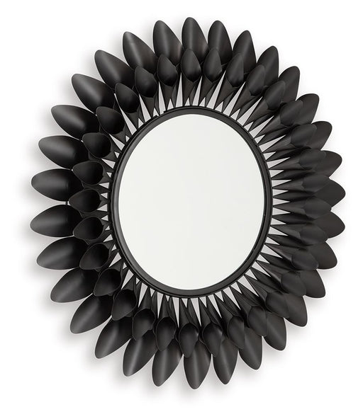 The striking flower power of this accent mirror creates a captivating focal point in your home. Crafted from sleek black metal, the layered petal f...