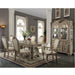 The Chateau De Ville traditional dining collection features elegant styling decorative carving and a combination of exotic materials. The double pedestal dining table with extended two leaves is accented by decorative base and feet. Matching hutch and buffet reflects all carefully selected design features as the dining collection. This collection will be the showpiece of your dining room environment.