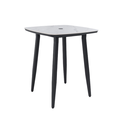 Modern Outdoor Bar Table, Rounded Square Sintered Stone Top With Umbrella Hole, Rust Free Frame, Weatherproof - Ember Black / White