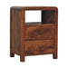 Features: solid wood, mango wood, chestnut, shiny brass knobs, bedside, bedroom, 2 drawers, open slot