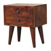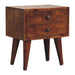 Mini Chestnut Modern Nightsand - Endlessly versatile, this mini nightsand table makes a perfect stand for nibbles, drinks, or a lamp and will prove handy all over your home. It is made from 100% solid mango wood in a chestnut finish and features 2 drawers. Other features include shiny knobs on the drawers and 4 Nordic-style legs.