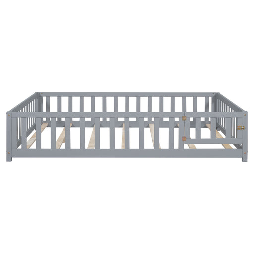 Montessori - Full Size Wooden Floor Platform Bed With Fence And Door, Montessori Floor Bed Frame With Support Slats For Toddlers - Gray