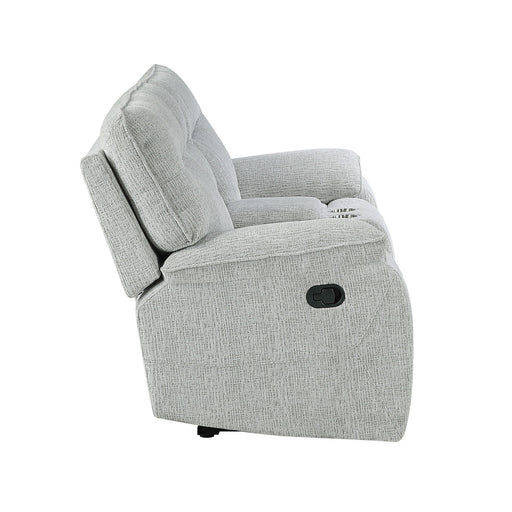 Enhance your living space with the perfect blend of comfort and functionality with the Chablis Reclining Console Loveseat in Mist Gray. Crafted wit...
