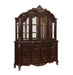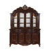 The Royal Classics Constantine 2-Piece China Buffet and Hutch Set in cherry is a stunning blend of heirloom craftsmanship and practical design, making it an elegant addition to any dining space. This set includes a china buffet base and a hutch top, both expertly crafted from solid pine and premium fancy face birch veneers, ensuring long-lasting beauty and durability. The meticulous multi-step finish enhances the natural grain of the wood, while burnished gold tipping highlights the intricate carvings, adding a luxurious touch. Inspired by 18th-century Rococo style, the ornate detailing brings a regal elegance and sophistication to your home. The mirrored hutch offers ample display space, beautifully illuminated with interior lighting to showcase your finest china and collectibles. Three velvet-lined drawers in the buffet securely store flatware, while the spacious open shelving behind the doors provides convenient storage for larger items. Combining beauty and functionality, this china cabinet is perfect for adding both style and versatility to your dining room.