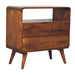 Console Curved Nordic Charm Artisan Furniture - This sleek console table is crafted from 100% Solid Mango Wood and finished in a warm Chestnut tone, showcasing its natural grain patterns. The design features two compact drawers with subtle brass black knobs, offering convenient storage, while the open shelf provides space for decor or essentials. The curved edges and Nordic-style legs lend a mid-century modern aesthetic, making it a stylish addition to living rooms, hallways, or bedrooms. Combining functionality with elegance, this piece elevates any space with its timeless design.