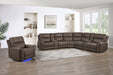 The Gaia Power Sectional in rich Sable Brown fabric offers modern style and premium comfort. Power headrests provide personalized support, while heat and air massage deliver relaxation. A zero gravity recline reduces pressure for weightless comfort, and tailored white contrast stitching adds a contemporary detail. This sectional combines durability, function, and design for the perfect centerpiece in any living room or home theater.