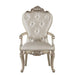 Exclusively designed and filled with romantic spirit, this beautiful chair features Queen Anne legs and carved apron and trim, decorated with raised and scrolled floral motifs in a golden ivory finish. This unique chair is upholstered in a cream fabric with crystal-like button tufting back. This stylish and detailed collection is ideal for a large gathering and will add elegance to any dining room Decor.