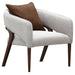 The Houston Accent Chair brings modern sophistication with a nod to mid-century elegance. Upholstered in a luxurious mingled boucle, its subtle blend of gray, ivory, and tan creates a refined and inviting look. The sculptural wood frame, finished in warm walnut, adds depth and contrast, while the curved barrel-back silhouette provides a stylish embrace. A reversible feather-filled accent pillow offers versatility in styling. Whether placed as a statement piece in any room or paired with the Houston collection, this chair elevates your space with understated glamour.