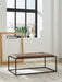 Master the art of casual chic with this coffee table ottoman. The soft, inviting top, upholstered in supple brown leather, is perfectly balanced by a clean-lined black metal base. Its expansive surface provides ample room for trays and books, making it a highly functional and oh-so-cool anchor for your seating area.