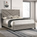 A fresh take on farmhouse design the Mari bedroom collection offers a sleek transitional design aesthetic. The bedroom set is finished in a stylish light gray with black accents that can appease anyone. The bed features a chevron-paneLED headboard and sits on black wooden legs. All the casegoods offer storage drawers with contrasting black metal pulls and sit on black wooden legs to match the bed. The dresser mirror is encased in a wooden frame to match the dresser.