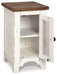 Double take. Sporting a two-tone finish that pairs a distressed vintage white with aged natural pine color, this chairside end table elevates the art of rustic farmhouse living. Enhancing its charm: shelved storage visible through the cabinet door with inset metal grill.