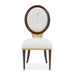 The Camellia Field Dining Side Chair blends elegance with unparalleled comfort. Its oval back showcases intricate camellia marquetry, while the warm pecan finish and antique gold accents create a harmonious balance of luxury and artistry. With a plush chenille seat and sturdy iron framework, this chair invites you to dine in effortless sophistication.