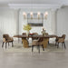 Perfectly paired with the table, the armchairs offer both comfort and style. Upholstered in rich latte synthetic leather, they feature a barrel-shaped silhouette with honeycomb tufting on the exterior for added texture and visual interest. The outer backrest is finished in glossy wood grain, while the inner seat and armrests are wrapped in the same soft leather for a cohesive, upscale look. Black legs provide a sleek contrast and modern edge.