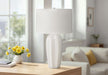 Art-Deco Design: This 27" table lamp features a cream ceramic tapered vase base with an ivory linen drum shade and a silver finial, adding modern, fashionable style to any room.